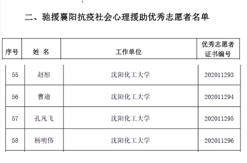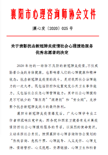 11月18日,襄阳市心理咨询师协会发布《关于表彰抗击新冠肺炎疫情社会心理扶助服务优秀志愿者的决定》(襄心发[2020]025号),经过襄阳抗疫社会心理援助服务25个志愿者团队的推荐和综合评审,共评选出333名抗击新冠肺炎疫情社会心理援助服务工作优秀志愿者,其中襄阳市辖区优秀志愿者238名,域外驰援襄阳的优秀志愿者95名。
