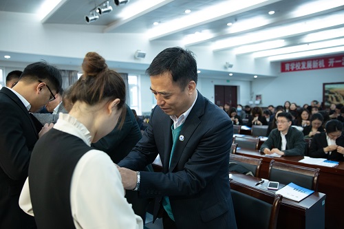 仪式上,孙宏灵副部长宣读了《2020年新教工入职培训方案》。与会领导为新教工佩戴校徽、颁发《新起点》入职教育手册。70名新教工正式加入学校大家庭,与学校同呼吸、共奋进,开启实现新时代“化大梦”新征程。于三三处长带领全体新教工庄严宣誓,“忠诚党的教育事业,履行教书育人职责,为教育发展、国家繁荣和民族振兴努力奋斗”!