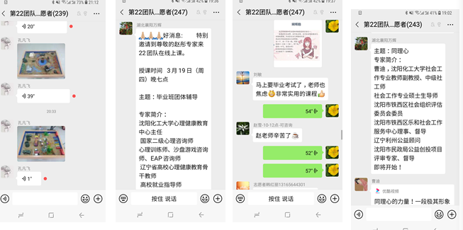 best365赵彤、曹迪、孔凡飞、杨明伟等4位老师加入湖北襄阳疫情心理辅导第22团队工作群,配合襄阳市心理咨询师协会,开展心理热线值班、心理讲座、心理健康知识普及等工作,分别针对团体辅导、咨询技术、心理沙盘、社会化等专题开展讲座,制作心理疏导、缓解情绪的音频与视频,与襄阳志愿者热烈讨论,参加疫后社会心理建设学术网络研讨会,和与会专家共同探讨疫后社会心理建设工作方案。4位教师为培植襄阳市民积极向上的社会心态、帮助襄阳市民走出疫情阴霾、更有信心地面对未来的生活做出自己应有的贡献。