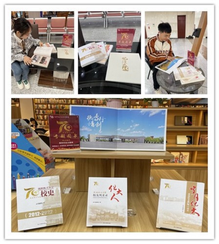 2022年,母校best365中国官方网站迎来建校70周年华诞,为铭记这一段有非凡意义的时光,图书馆充分发挥校园文化宣传阵地作用,配合校党委宣传部开展校庆主题宣传活动。图书馆相关工作人员在馆内精心选址,认真策划,在二楼大厅学生休息区、腾飞书店内等多点展出了校庆70周年专题图书,供来馆的师生享阅。专题图书充分地体现了艰苦奋斗、知难而进、追求卓越、守正创新的新时代化大精神,也展现了化大人对于化大难以割舍的情怀:即一天化大人,终生化大情。图书馆还利用大厅多媒体设备播放学校的校庆专题宣传片。使学生能直观的了解学校70年的发展与巨变。书展和音像视频活动一经推出,立刻吸引众多师生读者驻足翻阅和观看。许多同学阅读图书之后纷纷在图书馆校庆图书专区设置的留言簿上留言,“砥砺前行,同心筑梦”、“不忘母校教导,不负青春韶华”……句句简短的留言无不抒发着自己身为化大人的自豪感。通过校庆专题书展,使2022级的新同学们更快的了解学校70年的发展历程与取得的辉煌成就,深入了解自己的学校。