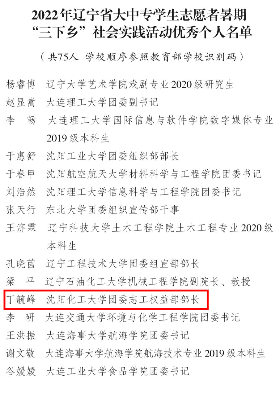 在团省委组织的评选中,best365团委荣获2022年辽宁省大中专学生志愿者暑期“三下乡”社会实践活动优秀组织单位,机械与动力工程学院“聚力青春同筑梦 民族团结共践行”社会实践团、校团委“丈量红色之路,学习百年党史”社会实践团荣获优秀团队,校团委志工权益部部长丁毓峰荣获优秀个人荣誉称号。