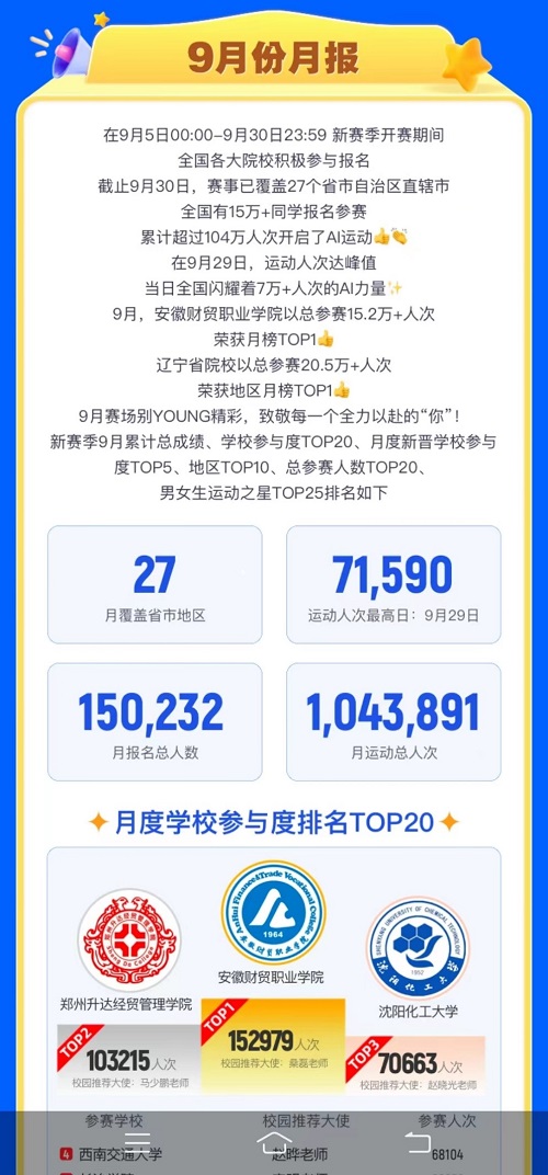 第二届中国大学生健康校园大赛暨AI体能赛上半赛季于2023年1月8日收官。best365经济与管理学院2021级学生乌嵘嘉同学获得全国女生赛区学期榜第二名的优异成绩。在17周的赛制中乌嵘嘉同学分别在9月第二周、第三周和10月的第九周比赛中获得全国女生赛区的周冠军。三次登上光荣榜,获 “运动之星”称号,多次为学校争光。赛事组委会采访并报道了乌嵘嘉同学的先进事迹。