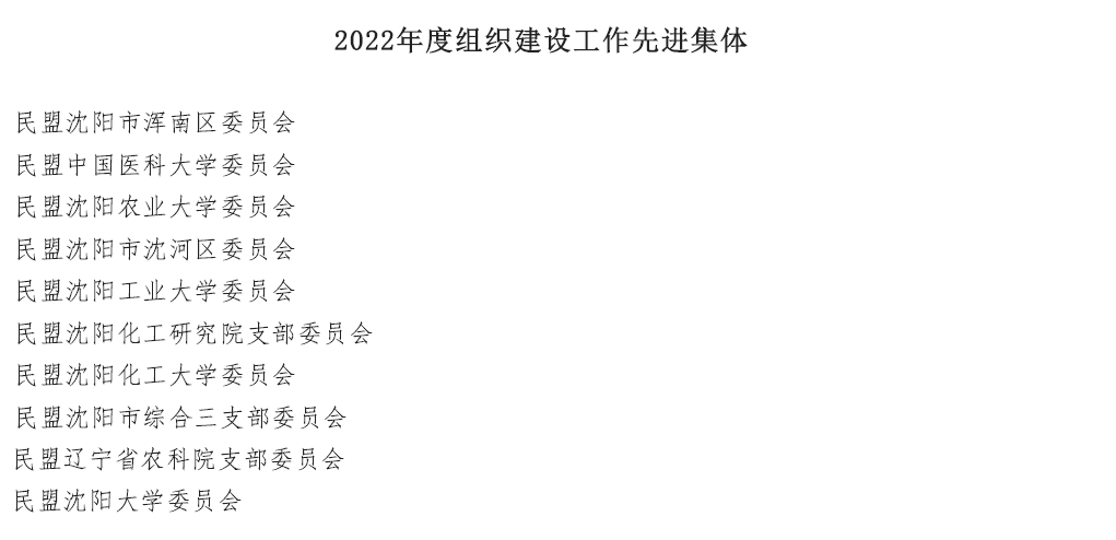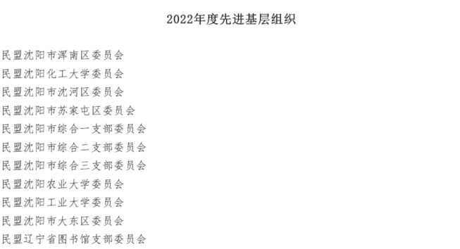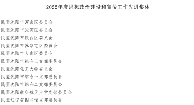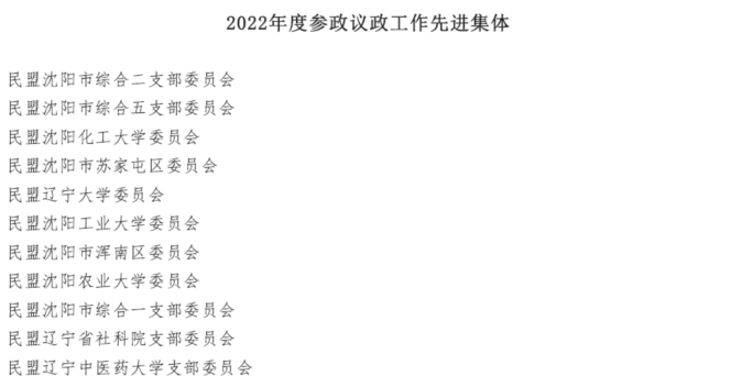 近日,民盟沈阳市委对2022年各项工作取得突出成绩的基层组织、专委会和在盟务工作中表现突出的盟员进行表彰。授予民盟best365中国官方网站委员会 “先进基层组织”、“思想政治建设和宣传工作先进集体”、“参政议政工作先进集体”和“组织建设工作先进集体”四个荣誉称号。
