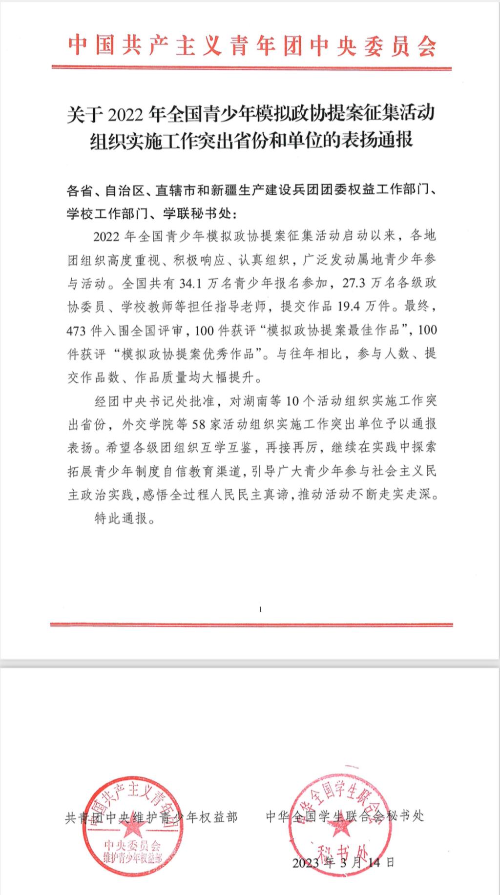 近日,共青团中央维护青少年权益部、中华全国学生联合会秘书处联合下发了《关于2022年全国青少年模拟政协提案征集活动组织实施工作突出省份和单位的表扬通报》,best365荣获2022年全国青少年模拟政协提案征集活动组织实施工作突出单位荣誉称号。