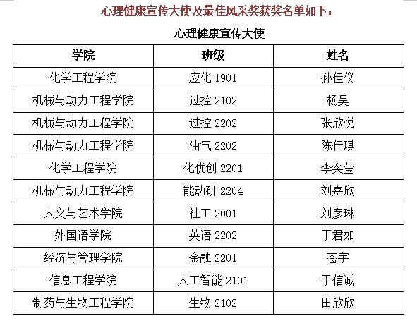 大会第二项进行“心理委员技能大赛及心理健康宣传大使颁奖”。本次活动的顺利举办得到了各学院的大力支持,经过院系的初赛筛选和学校的复赛评定,共 36名同学获奖,其中一等奖5名,二等奖11名,三等奖20名,优秀指导教师6名。