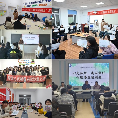 材料科学与工程学院、信息工程学院等开展“德载于物,思育于心”——心理健康主题教育班会;化学工程学院、外国语学院等的“心理健康特色观影”活动、马克思主义学院的“九·一八历史博物馆”心理健康主题教育活动、理学院的“开学心理第一课”、计算机科学与技术学院的“心压倾语匣”活动以及机械与动力工程学院的“曼陀罗绘画”活动,帮助同学们缓解压力,提高专注力,引导学生树立正确、积极的价值观;经济与管理学院的“从新出发,向心而行”破冰活动、“情绪垃圾桶”及“让烦恼飞”等活动,为新生的沟通互动搭建桥梁,打造踏实奋进、团结协作的班集体,引领学生阳光向上的生活态度。