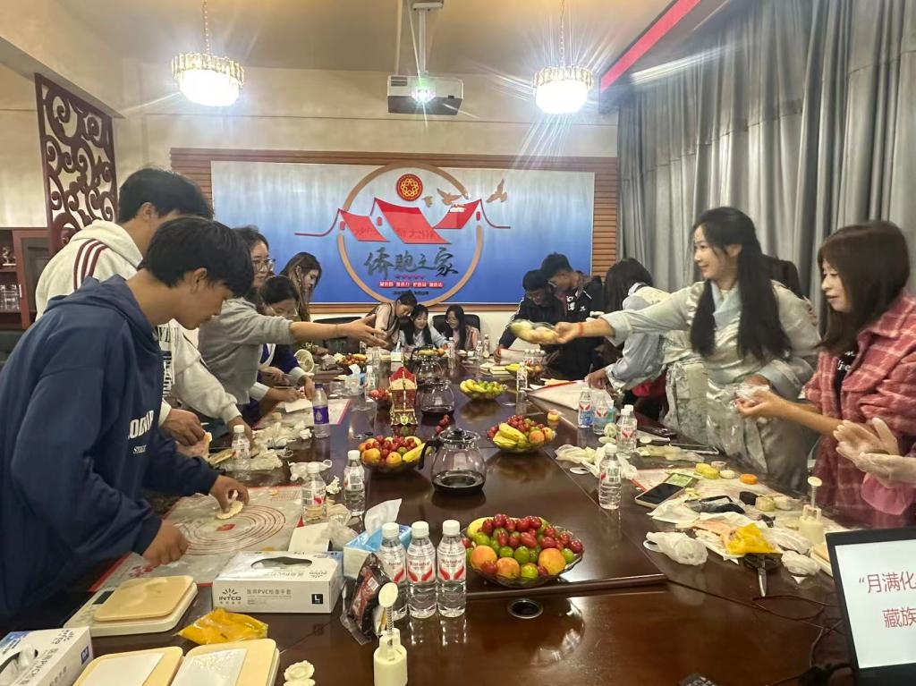 活动在温馨的祝福声中拉开帷幕。在优美的乐曲声中同学们纷纷起身,展示才艺,进行歌舞表演。随后,在统战部凌霞老师的指导下,大家分工合作,揉面团、包馅、压模,现场一片忙碌。