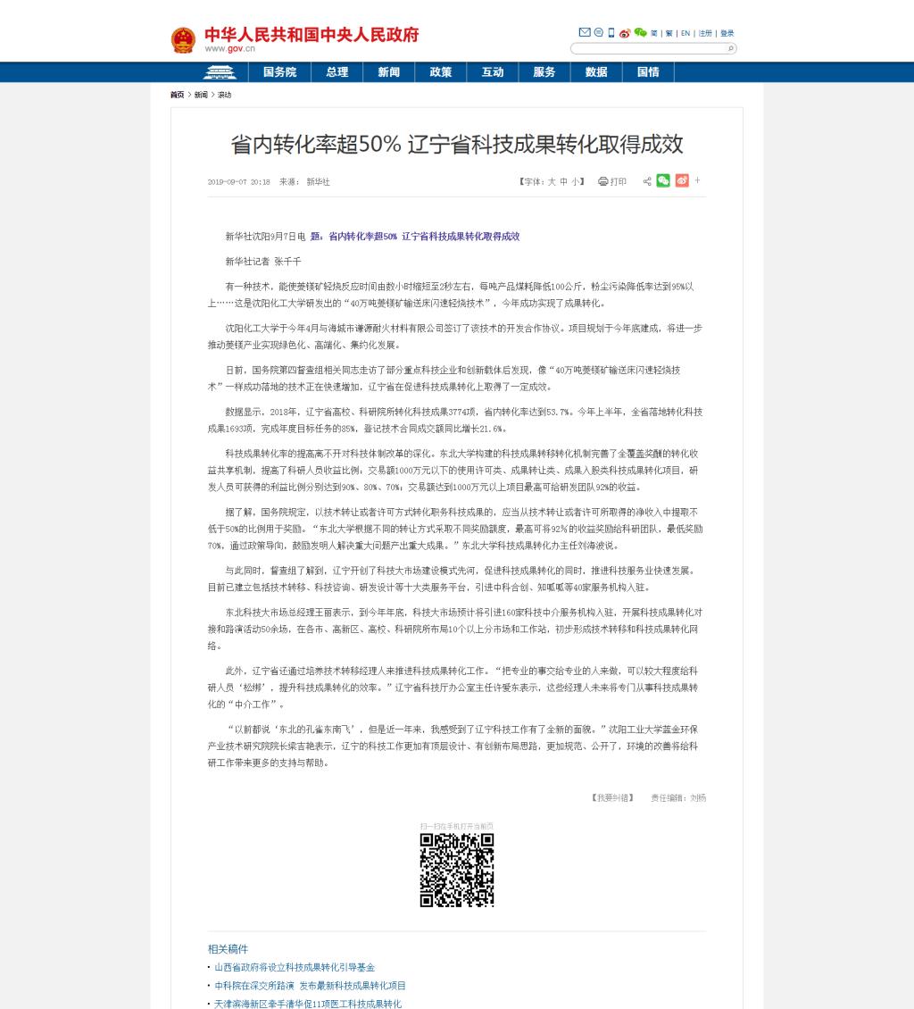 9月7日,国务院网站刊登新华社记者张千千采写的新闻《省内转化率超50% 辽宁省科技成果转化取得成效》。该新闻对best365“40万吨菱镁矿输送床闪速轻烧技术”在海城落地事宜进行了报道。现将该新闻转载如下: