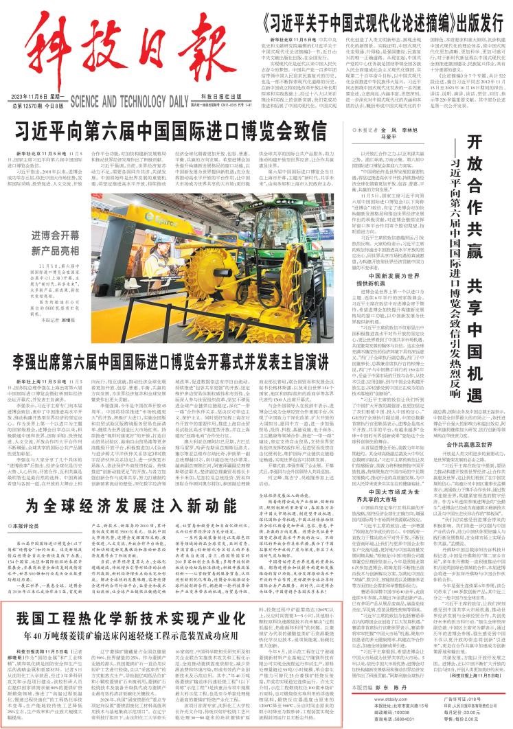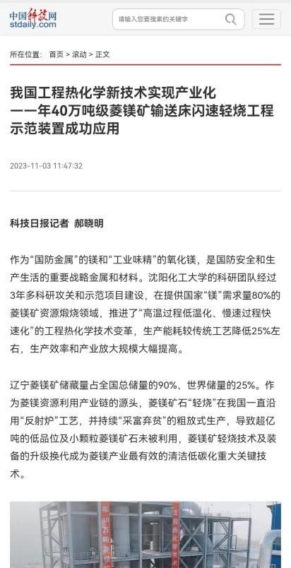 11月6日,《科技日报》头版以“我国工程热化学新技术实现产业化 年40万吨级菱镁矿输送床闪速轻烧工程示范装置成功应用”为题对best36540万吨菱镁矿输送床闪速轻烧工程实现工业化运行进行了报道。
