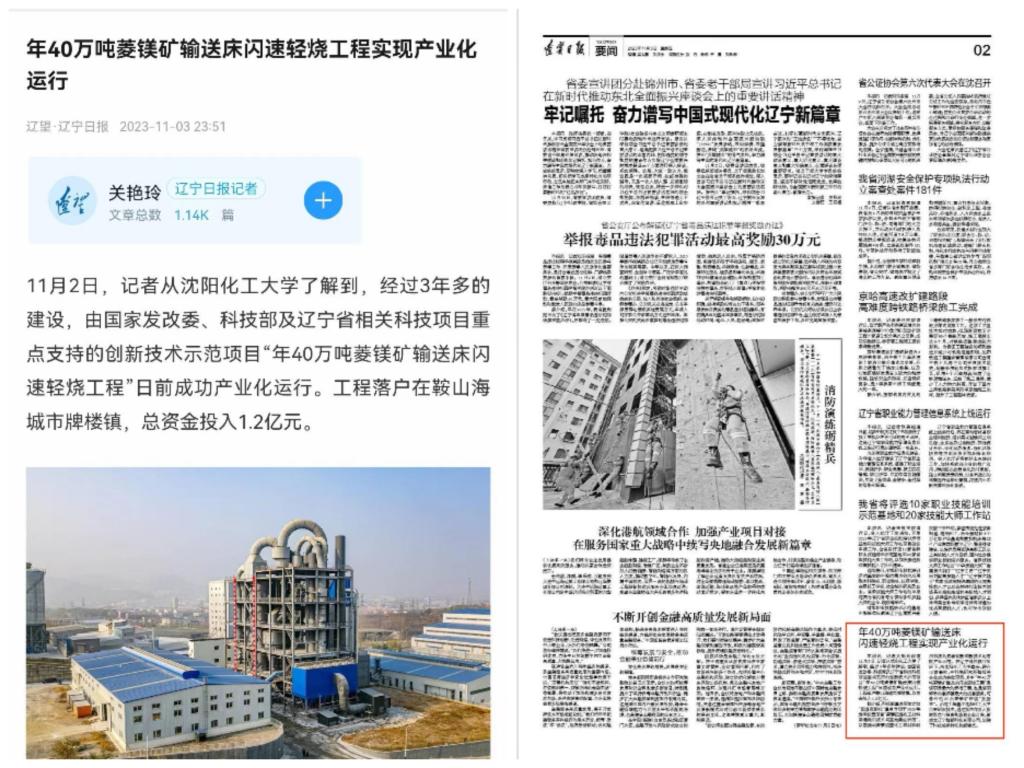 目前,“年40万吨级菱镁矿输送床闪速轻烧示范工程”被列为辽宁省菱镁产业升级和技术改造重点示范项目,成功入选国家重大建设项目库,并获批国家发展改革委产业创新链整合项目,其推广应用将推动我国菱镁产业的关键技术迭代和变革性提升。