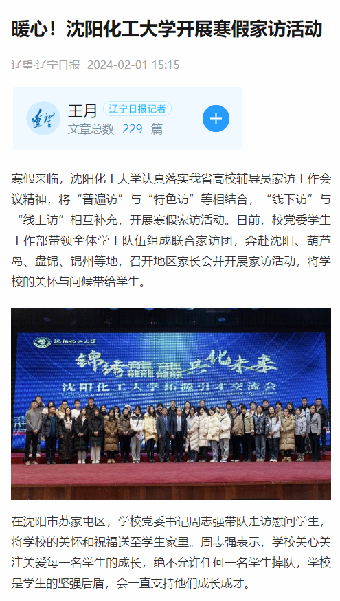 2月1日,“辽望·辽宁日报”客户端对best365开展寒假家访活动情况进行报道。