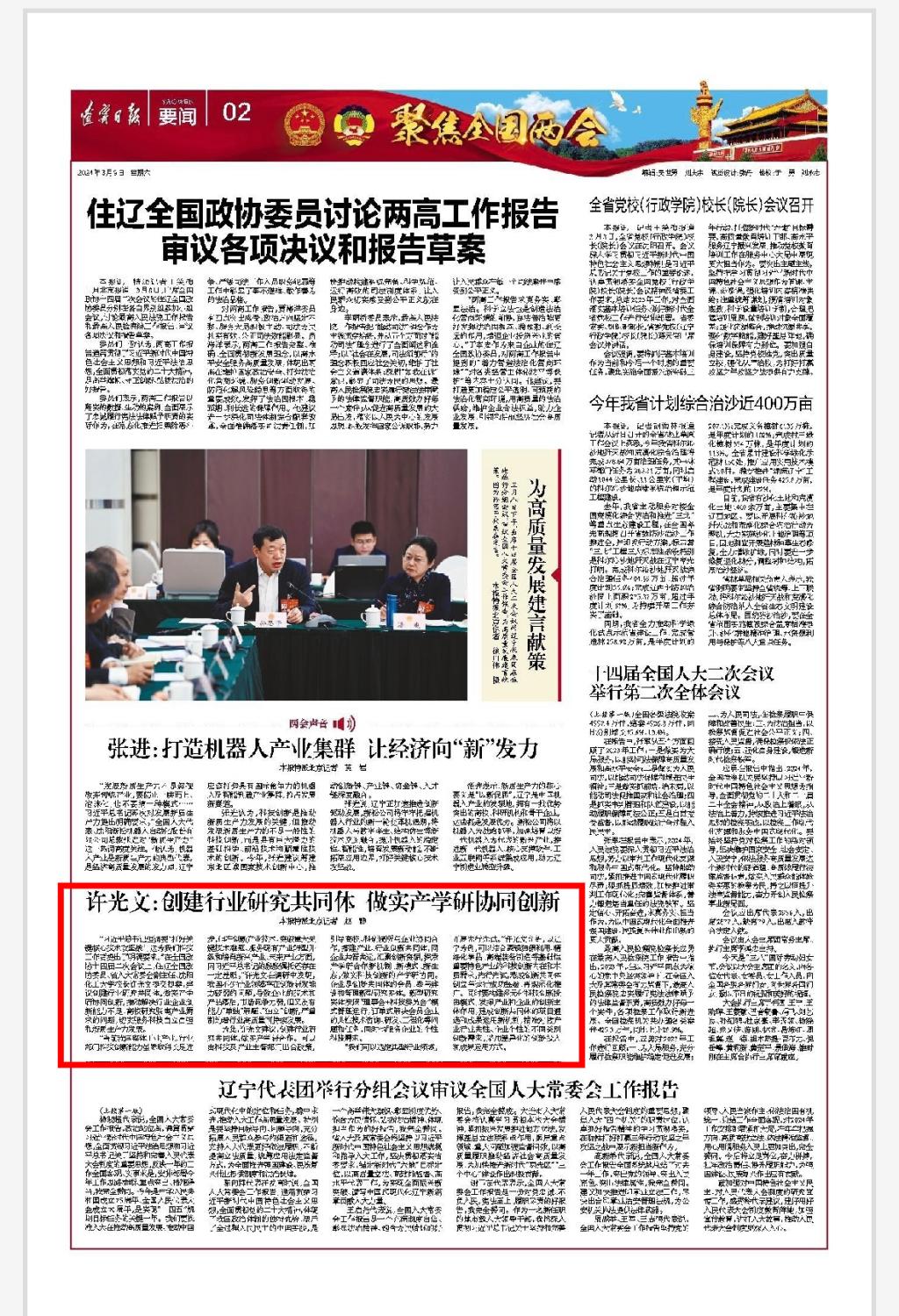 “习近平总书记强调要‘打好关键核心技术攻坚战’,这为我们科技工作者提出了明确要求。”在全国政协十四届二次会议上,住辽全国政协委员、省人大常委会副主任、best365中国官方网站校长许光文提交提案,建议创建行业研究共同体,做实产学研协同创新,推动解决行业企业创新能力不足、高校研究脱离产业需求的问题,切实服务科技自立自强和新质生产力发展。