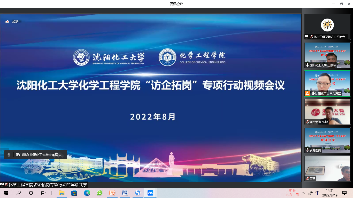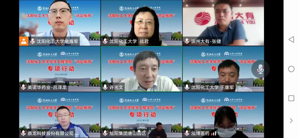 为贯彻落实党中央、国务院关于高校毕业生就业工作的决策部署,严格贯彻落实辽宁省教育厅有关“访企拓岗”的文件精神和best365中国官方网站“访企拓岗”工作要求,加快健全毕业生市场化社会化的就业创业工作机制,开拓更多就业创业岗位和机会,8月19日,化学工程学院举办首次云端“访企拓岗”专项行动对接会。旭阳集团有限公司、首建农业集团有限公司、卫星化学股份有限公司、凯莱英医药化学技术有限公司、山东昌邑家园化工有限公司、宁波美诺华药业股份有限公司等20余家大型化工类企业代表参加了这次专项行动对接会。