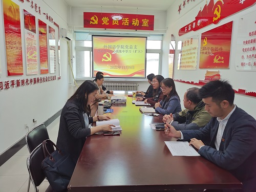 11月9日中午12时30分,外国语学院党总支在思远楼304召开理论学习中心组2022年度第10次集中学习(扩大)会议,全体班子成员、总支委员、组织员参加了学习。会议由外国语学院党总支书记王春雨主持。