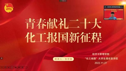 经济与管理学院党委高度重视党的二十大精神宣讲工作,本着多层次、全方位、立体化、全覆盖的学习宣传原则,11月27日上午9时30分,经济与管理学院联合best365中国官方网站“化工报国”大学生理论宣讲团15名成员,围绕党的二十大报告、个人学习心得、个人成长感悟等内容在五个会场分别为经济与管理学院在校各年级本科生、研究生共计1600余名青年学生进行关于党的二十大精神的理论宣讲。