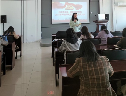 王春雨书记作动员讲话。近年来,外国语学院和国际教育学院全面落实立德树人根本任务,贯彻落实学校历次党代会各项任务,引导教师切实肩负起“立德树人、教书育人”的光荣使命。全体教师要准确对标新时代、新形势、新要求,深刻认识到师德师风建设的重要性,牢记立德树人崇高使命,以良好的师德师风自觉维护教师职业形象,用实际行动自觉践行以德立身、以德立学、以德施教、以德育德,努力做一名政治素质过硬、业务能力精湛、育人水平高超的高素质高校教师,为助力建设“五彩化大”贡献力量和智慧!