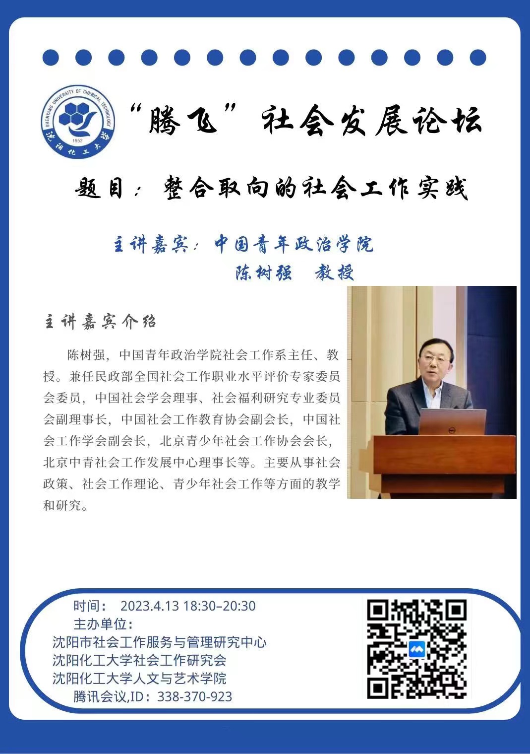 4月13日,由沈阳市社会工作服务与管理研究中心、best365中国官方网站社会工作研究会、人文与艺术学院主办的“腾飞”社会发展论坛在线举行,中国社会工作教育协会副会长、中国青年政治学院教授陈树强作题为“整合取向的社会工作实践”讲座,人文与艺术学院陈晓东教授、李漫红教授、社会工作专业教研室全体教师、社会工作专业研究生与本科生共同参加。
