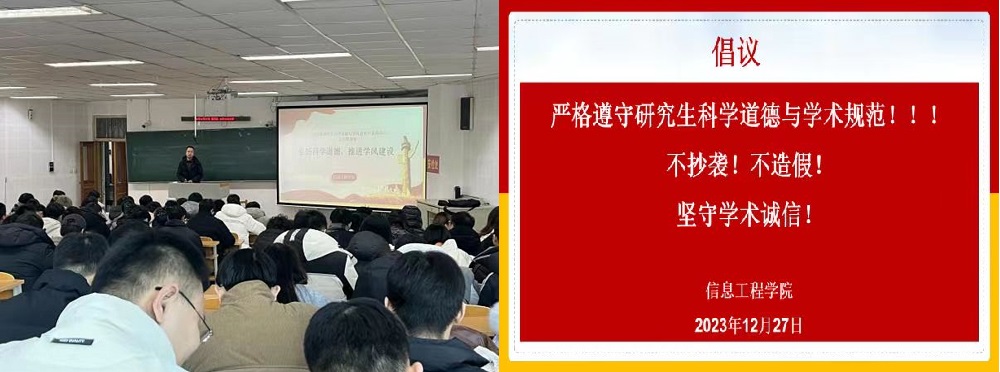 在系列活动之“专题讲座”环节,杨忠君副教授为大家宣传了“弘扬科学道德,推进学风建设”的重要性。通过解读《高等学校预防与处理学术不端行为办法》等相关文件和介绍学术不端行为的相关案例,使同学们深刻认识到学术不端的严重后果,并向信息工程学院全体研究生提出以下倡议:“严格遵守研究生科学道德与学术规范!不抄袭!不造假!坚守学术诚信!”
