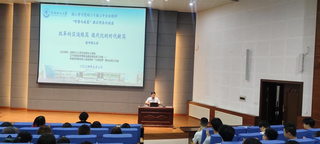 9月3日,由马克思主义学院、辽宁省“构建协同育人机制讲好‘大思政课’贾冰名师工作室”主办的深入贯彻学习党的二十届三中全会精神“形势与政策”课名师系列讲座在碧帆楼304报告厅开讲。本次讲座由辽宁省委党校马克思主义学院徐作辉教授主讲,主题为“改革的实践续篇 现代化的时代新篇”。化学工程学院2023级学生和马克思主义学院师生代表近400人现场聆听讲座。