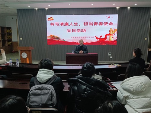 为进一步加强毕业生党员纪律建设,增强廉洁意识,扣好走向社会的“第一粒扣子”,12月13日,经济与管理学院开展“书写清廉人生,担当青春使命”2025届毕业生党员廉洁从业主题教育活动,学院党委书记李丙文、党委副书记关婷、组织员信莹以及全体2025届研究生毕业生党员参加活动,学院研究生第二党支部书记刘璐主持。