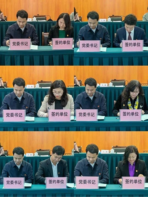 党委书记王强与党组织代表——制药与生物工程学院党总支书记赵慧、计算机科学与技术学院党总支书记王立刚、外国语学院党总支书记王春雨、教辅党总支书记林艳新、党委教师工作部部长姜维、党委研究生工作部部长衣福艳签订了《党建、党风廉政建设、意识形态工作责任书》。