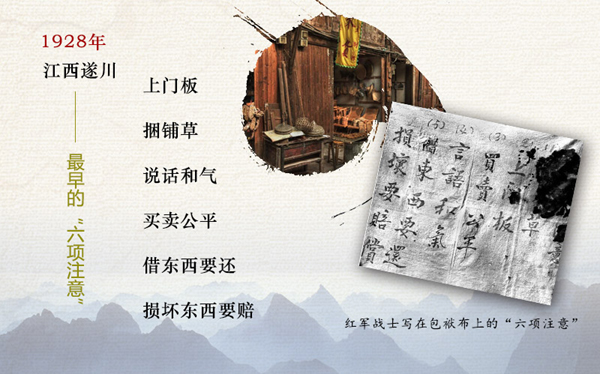 1928年1月,工农革命军占领遂川县城后,以“宣传队”开展宣传活动,还派人下乡领导贫苦农民打土豪。其间,也有些人把商人、小贩的货物没收了,甚至把药店里称药的戥秤也拿了。毛泽东进城后不断找群众谈话,了解群众对部队的意见,发现了不少问题。为了解决部队存在的纪律和作风问题,毛泽东于1月25日在遂川李家坪向部队宣布了最早的“六项注意”:上门板;捆铺草;说话和气;买卖公平;借东西要还;损坏东西要赔。