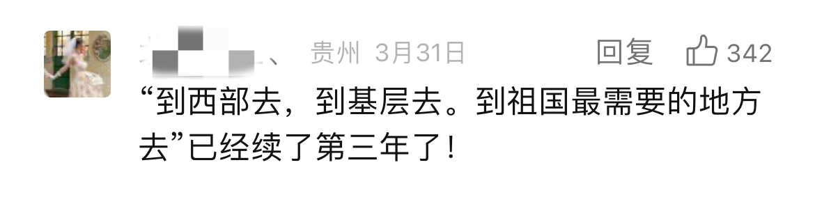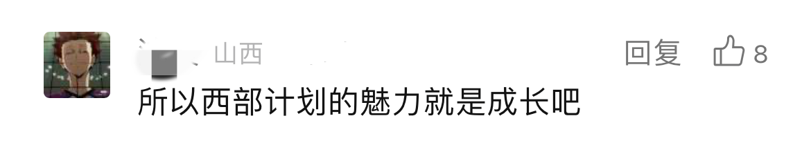 我们感动于一条条发自肺腑的留言,也欣慰于他们义无反顾的选择,更令人动容的是背后那份蓄势已久的“真行动”。“不论是四年前还是四年后,到西部去的想法不仅没变,且越来越清晰。在大学里,我积极参加志愿服务,保持综测和专业学习成绩,到基层组织学习,并光荣成为一名中共党员。付出的努力都让我更有信心和大家一起奔赴西部!”“想去,并且已经说服了爸妈,意愿服务地——西藏,两年后见”“在等毕业,也在等更优秀的自己,希望三年后能成功,西部等我”......西部计划招募对象主要为高校应届毕业生,但不少低年级的大学生朋友们早早动手,主动了解、提前谋划、持续提升,在全力以赴追逐目标的过程中,逐渐练就更加适应西部发展所需、更好在基层“乘风破浪”的“十八般武艺”,增添了更多“我能”“我行”的信心和底气,努力成长为合格的西部计划“后备军”。在离那片孕育理想的西部热土越来越近的同时,也在一步一个脚印遇见更好的自己。