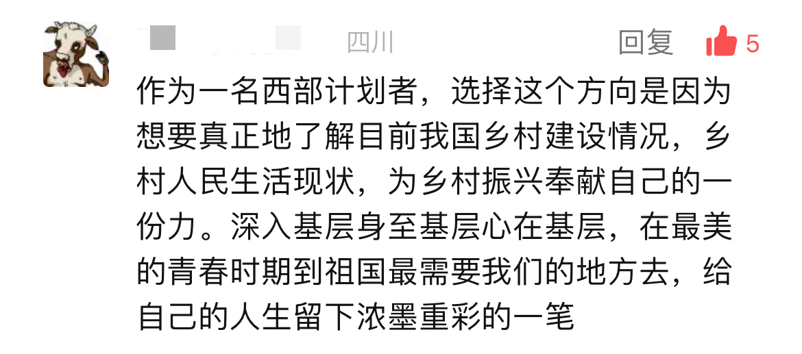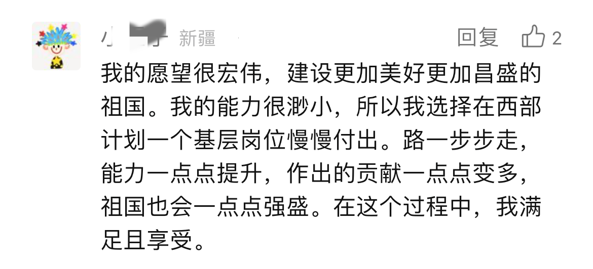 从留言中我们不难看到,这群年轻人理智规划的“冷思考”。“我的理由可能没有那么宏大,马上就要毕业了有点迷茫。我就是想在从学校到社会这个跨度中,有机会切实感受基层工作内容,在实践中寻找自己的人生方向,做出人生更准确的选择”“选择西部计划是因为想要真正地了解目前我国乡村建设、乡村人民生活现状,出一份力”“我的愿望很宏伟,建设更加美好的祖国。但我的能力很渺小,所以我想在西部计划一个基层岗位上慢慢付出”…… 透过这些文字,我们仿佛能看到这群即将走出“象牙塔”站在人生十字路口的年轻人正在认真思考“我要成为什么样的人?”“党和祖国需要什么样的我?”。