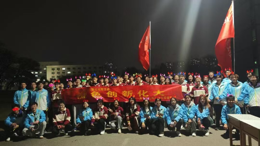 2024年11月8日晚百余名化大学子集聚在体育场,共同参加了“荧’接青春,逐光奔跑”主题荧光夜跑活动。此次活动由校团委主办,校学生会文体部承办,旨在让同学们在奔跑中释放青春活力,展现当代化大学子的青春风采。出席活动的有校团委战申书记、2023届校友沈阳工业大学教师蔡泽旭、各学院分团委书记和团委老师及来自11个学院的6支代表方队。随着校团委战申书记的一声“出发”,蓄势待发的六个方队气势奔腾的出发了。他们在黑暗中疾驰,身姿矫健而灵动,每一个脚步都似踏在青春的鼓点上,充满了无尽的力量与热情。同学们迈着坚定的步伐,朝着目标前进。方队成员们保持着整齐的队列、挥动着旗帜,展现出高度的纪律性和团队精神,让我们一起来回顾一下精彩的瞬间。