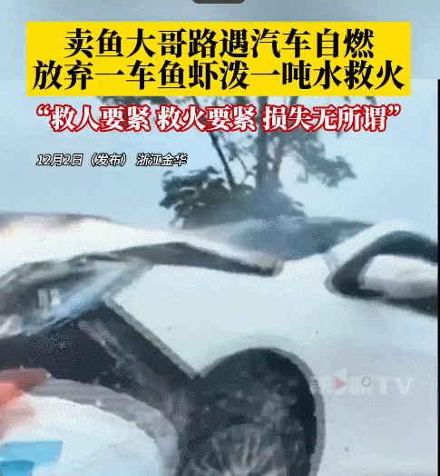2024年12月,有媒体报道,在浙江金华,一卖鱼大哥路遇汽车自燃,放弃车上200多斤鱼虾,从车里舀了一吨水救火,将火势成功控制。他说:“救人要紧,救火要紧,损失无所谓。”