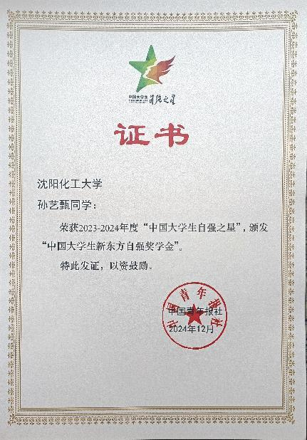 近日,从共青团中央、全国学联传来喜讯,由团中央基层建设部、中国青年报社、新东方教育科技集团、中国青年创业就业基金会联合举办的2023 - 2024年度“中国大学生自强之星”奖学金评选结果揭晓,best365孙艺甄同学凭借出色的个人表现和突出的自强事迹,荣获“中国大学生自强之星”荣誉称号。