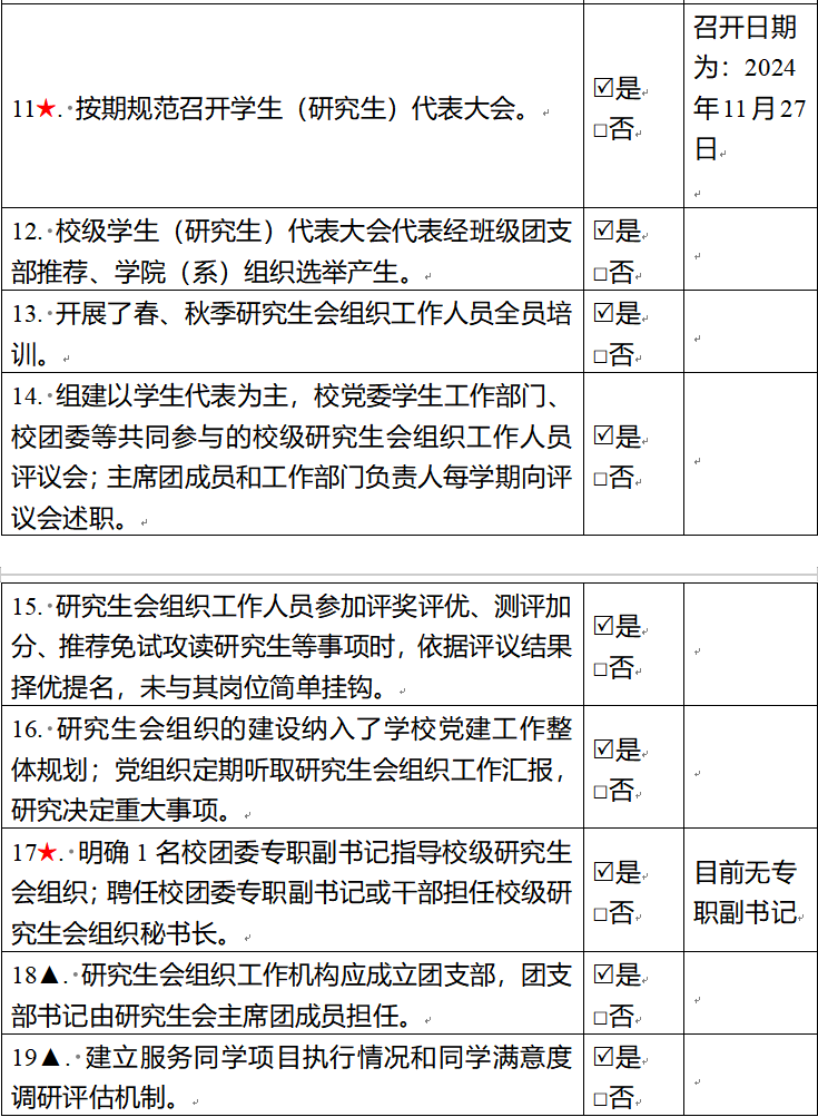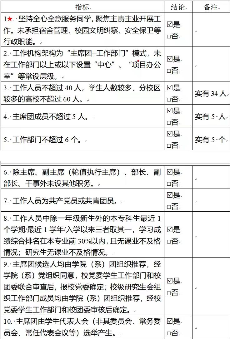为落实共青团中央、教育部、全国学联联合下发的《关于推动高校学生会(研究生会)深化改革的若干意见》,并结合《关于巩固高校学生会(研究生会)改革成果的若干措施》文件要求,接受广大师生监督,现将best3652024—2025学年研究生会改革情况公开如下。一、改革自评表(一)校级研究生会组织改革自评表标注“★”为核心指标;标注“▲”为观测指标,2024—2025学年暂不作硬性要求。