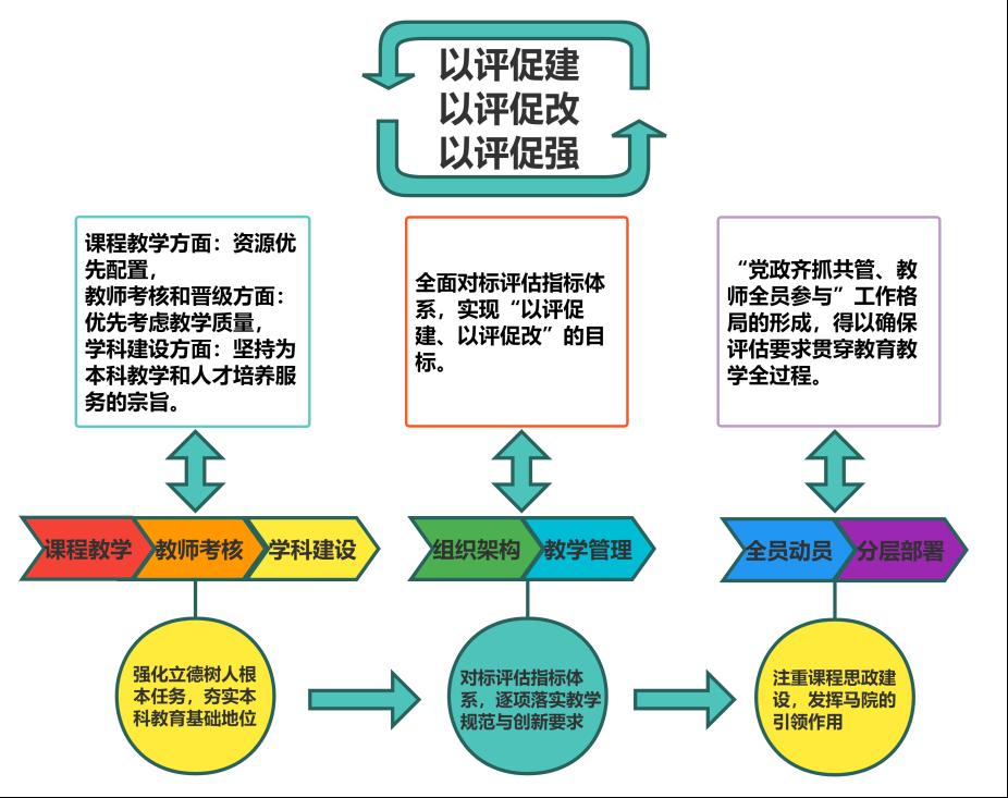 马克思主义学院始终将本科思政课教学放在基础地位,强化立德树人根本任务。一是做好思政课教学中心工作,着力培养时代新人,在课程教学方面实现资源的优先配置,马克思主义学院按照教育部要求设置学时学分,设置了习近平新时代中国特色社会主义思想概论、毛泽东思想和中国特色社会主义理论体系概论、马克思主义基本原理、中国近现代史纲要、思想道德与法治、形势与政策教研室,制定了集体备课、教学效果监测评价、教师培训提升等一系列教学制度,规范教学管理,在教师岗位考核和晋职晋级方面优先考虑本科教学工作质量,在学科建设方面坚持科研与学科首先要为本科教学和人才培养服务的宗旨。二是落实教学规范与创新要求,全面对标评估指标体系。马克思主义学院通过系统化的组织架构、规范化的教学管理、多维度的质量监控及创新驱动的特色凝练,增强思政课教学效果。三是注重课程思政建设,发挥马克思主义学院在全校课程思政中的引领作用。马克思主义学院制定了思政课程与课程思政相融合的工作方案,通过全员动员、分层部署,鼓励思政教师加入专业课教师研究项目、教学团队,共同探索实践融合机制的方式方法,形成了“党政齐抓共管、教师全员参与”的工作格局,不断创新工作方式方法,持续提升课堂教学效果。